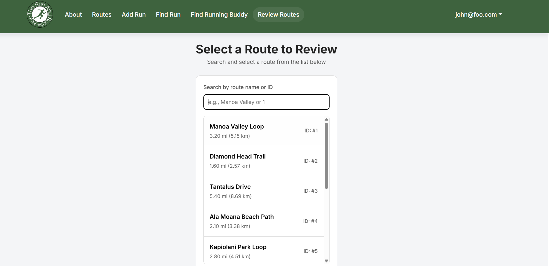 This page is the other end of the find running buddies that allows you to view all the routes and click on one you wish to review. An option to search using ID is available in the search bar.