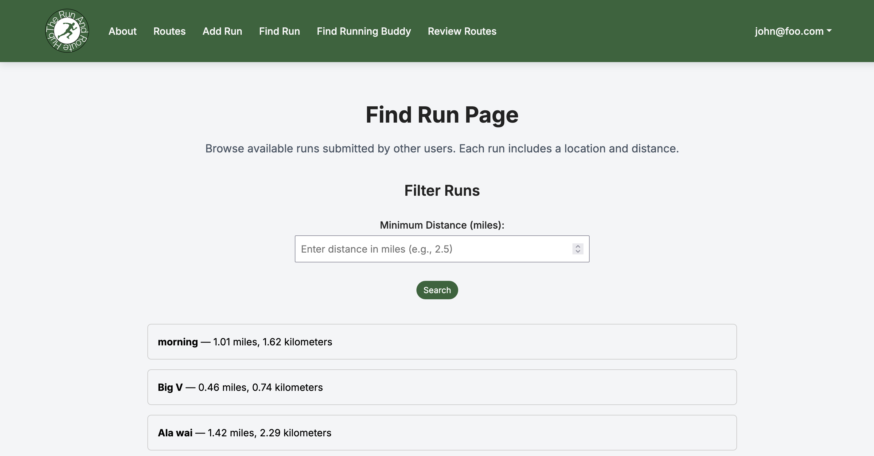 This page allows you to find all runs posted to the sight, with their distances and allows you to click them for a more detailed perspective on where they are.
